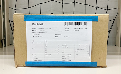 製品のご発送の際には、外箱の見えやすい部分に「照射申込書」を貼り付け、発送してください。お申込みと入荷品の照合のためご協力をお願いいたします。