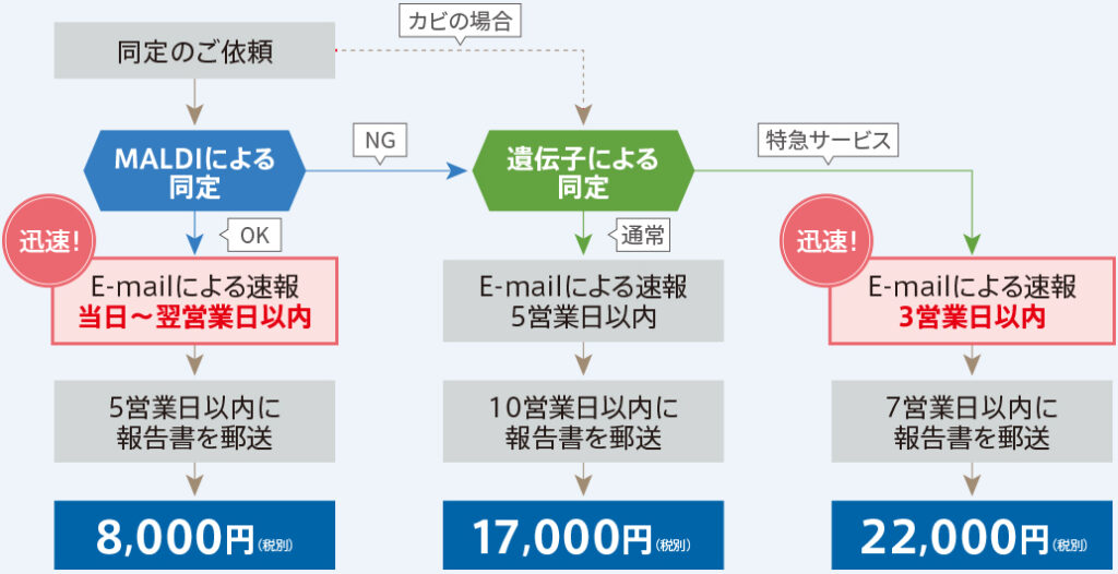 また、お客様のご都合に合わせて、「MALDI-TOF MSのみ」、「遺伝子のみ」のご依頼も可能です。