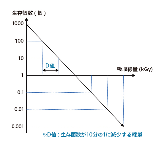 D値とは微生物数を1/10に減少させるのに必要な線量です。微生物の種類により、放射線に対する抵抗性が異なります。段階的な線量になるように照射して、生存菌数を測定することにより、D値を測定することができます。